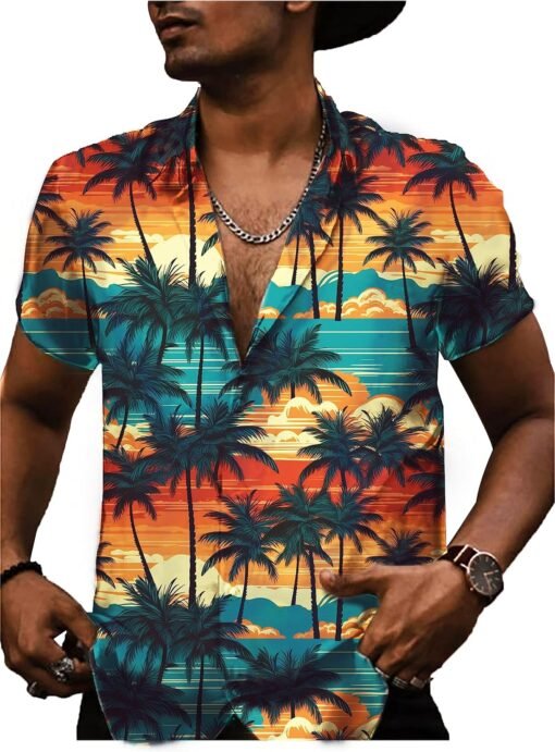 Men Hawaiian Shirt Beach Short Sleeved Floral Pattern Button Top